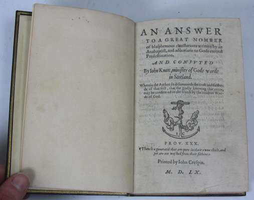 An Answer to a Great Nomber of Blasphemous Cavillations... [Geneva]: John Crespin, 1560. First edition, 8vo, errata leaf, 19th century purple morocco, running title sometimes trimmed by binder with some slight loss, a few very minor ink notations, a little rubbed [ESTC S108122], rust hole ot Y6 and EE1 affecting a couple of letters