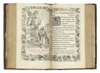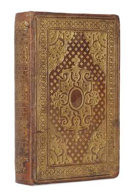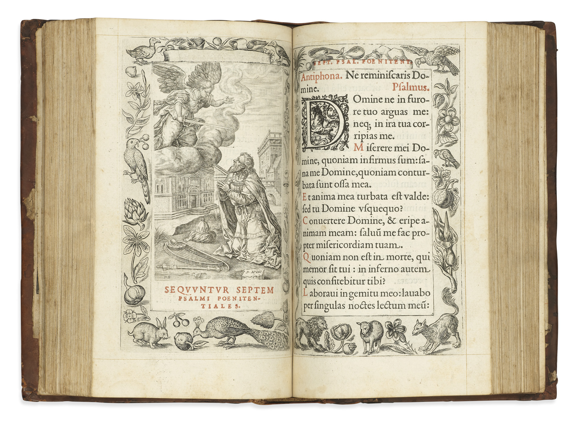 Antwerp: Christoph Plantin, 1570. 8vo, headlines, initial letters and headings printed in red, engraved title, text throughout within decorative engraved border by Pieter van der Borcht, seventeenth century gilt stamped panelled calf, hole to B6 affecting engraving on verso, some small marginal dampstains, mainly to lower margin, rebacked retaining most of original spine, corners worn and repaired