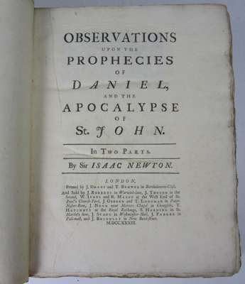 Observations upon the prophecies of Daniel, and the Apocalypse of St. John. London: J. Darby and T. Browne for J. Roberts, 1733. 4to, two parts in one volume, original boards, spine lacking and therefore boards detached, pages loose