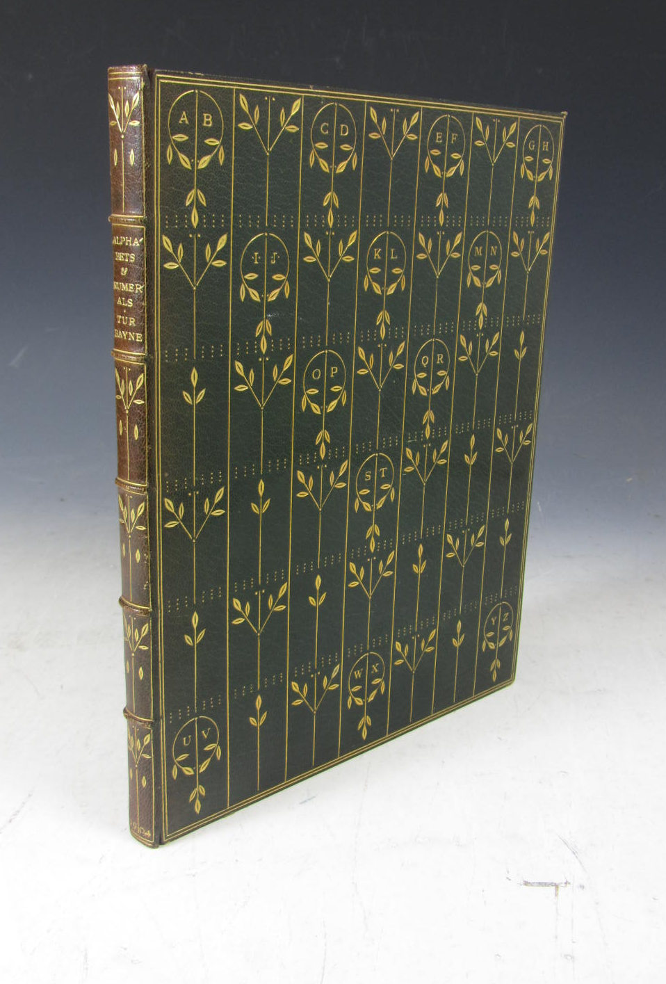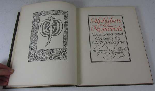 Alphabets & numerals... London and Edinburgh: T.C. & E.C. Jack, 1904. 4to, 27 plates, a.e.g., finely bound in dark green morocco with gilt tooled motifs of leaves running along gilt bands with circles containing various letters, bound in 1905 by 'L.G.W.', spine slightly faded