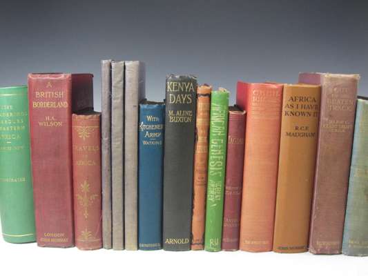 Life, wanderings and labours in Eastern Africa. Hodder and Stoughton, 1874. Second edition, 8vo, modern cloth; Wilson, H.A., Captain A British borderland. John Murray, 1913. 8vo, original red cloth gilt; Forbes, A. Gruar Africa: geographical exploration. Sampson, Low..., 1874. Small 8vo, printed red cloth gilt; Palmer, H.R. Sudanese memoirs. Lagos: Government printer, 1928. 3 volumes, 8vo, purple cloth gilt; Watkins, Owen S. With Kitchener's army. S.W. Partridge..., 1900. 8vo, green cloth gilt; Buxton, M. Aline Kenya days. Edward Arnold..., 1927; Johnson, Harry Night and morning in dark Africa. London Missionary Society, [n.d.]; Ardrey, Robert African genesis. Readers Union, 1963. 8vo, dust-jacket; Stanley, Henry M. Magdala. Sampson, Low..., 1896. 8vo; Johnson, T. Broadwood Tramps round the mountains of the moon. Boston: Dana Estes, 1909. 8vo, original cloth; and a quantity of others, sold not subject to return (quantity)