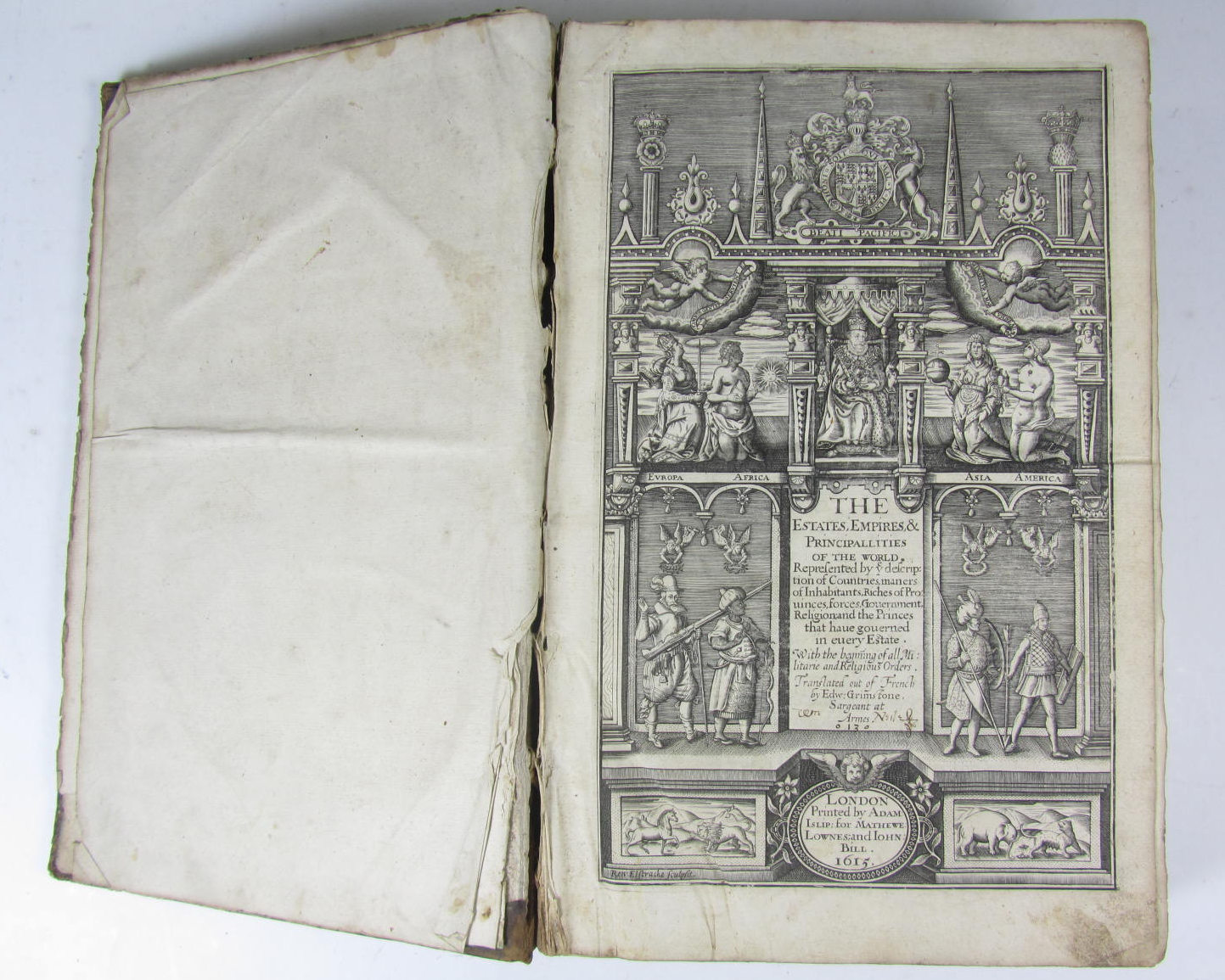 The estates, empires & principallities of the world... translated out of French by Edw. Grimstone. London: Mathew Lownes & Joyhn Bill, 1615. Folio, engraved title, contemporary calf, head of spine & corners worn [ESTC S106836; STC 988]