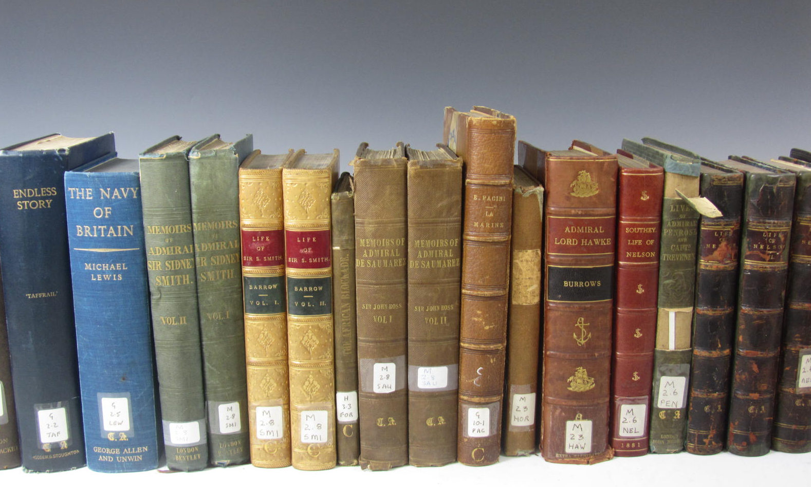 A midshipman of the Bellerophon. Memoirs of an aristocrat and reminiscences of the Emperor Napoleon. 1838. 8vo, original[?] cloth; [Howard, Edward] Memoirs of Admiral Sir Sidney Smith. 1839. 2 volumes, 8vo, original[?] blue cloth; Barrow, John The life and correspondence of Admiral Sir William Sidney Smith. 1848. 2 volumes, 8vo, later calf gilt; Forbes, F.E., Lieutenant Six months' service in the African blockade. 1849. 8vo, folding map, green cloth; Ross, Sir John Memoirs and correspondence of Admiral Lord de Saumarez. 1838. 2 volumes, 8vo, original[?] cloth; Pacini, M. Eugène La marine... Paris, 1844. Large 8vo, contemporary half morocco; Sharp, James A. Memoirs of the life and services of Rear-Admiral Sir William Symonds.1858. 8vo, folding plates, half morocco; Wood, Walter Famous British war-ships. 1897, original blue pictorial cloth; Dorling, Taffrail, Captain Endless story. 1931. 8vo, blue cloth; Lewis, Michael The navy of Britain. 1948. 8vo, blue cloth gilt; and a quantity of others, all with Cruising Association bookplates, blind-stamps and gilt stamps to covers and spines, sold not subject to return (quantity)
