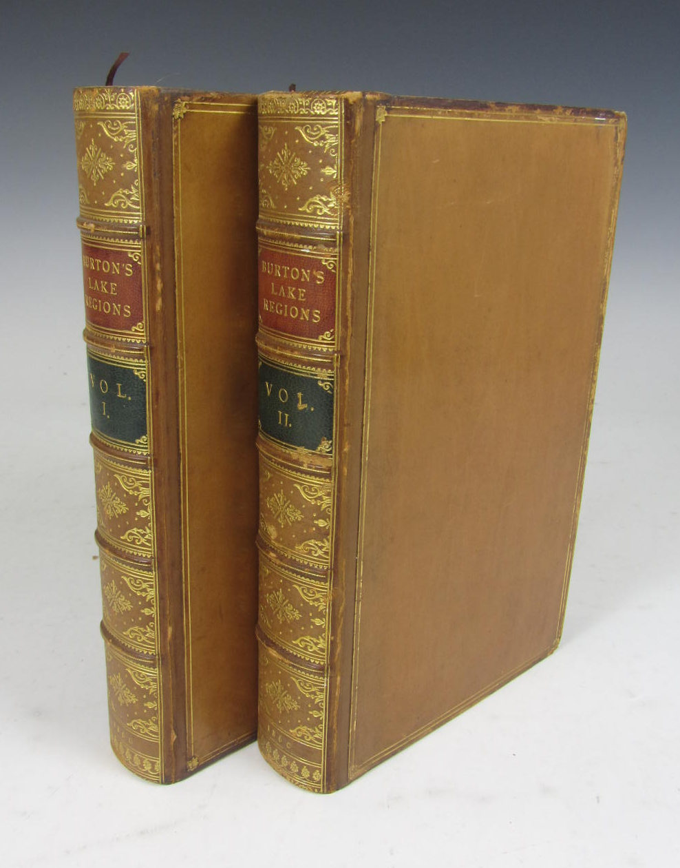 The lake regions of central Africa. London: Longman, Green, Longman, and Roberts, 1860. First edition, 2 volumes, 8vo, 2 chromolithographed frontispiece, folding map, 10 chromolithographed plates, contemporary calf gilt sensitively rebacked, a couple of small tears to corners with no loss of text (2)