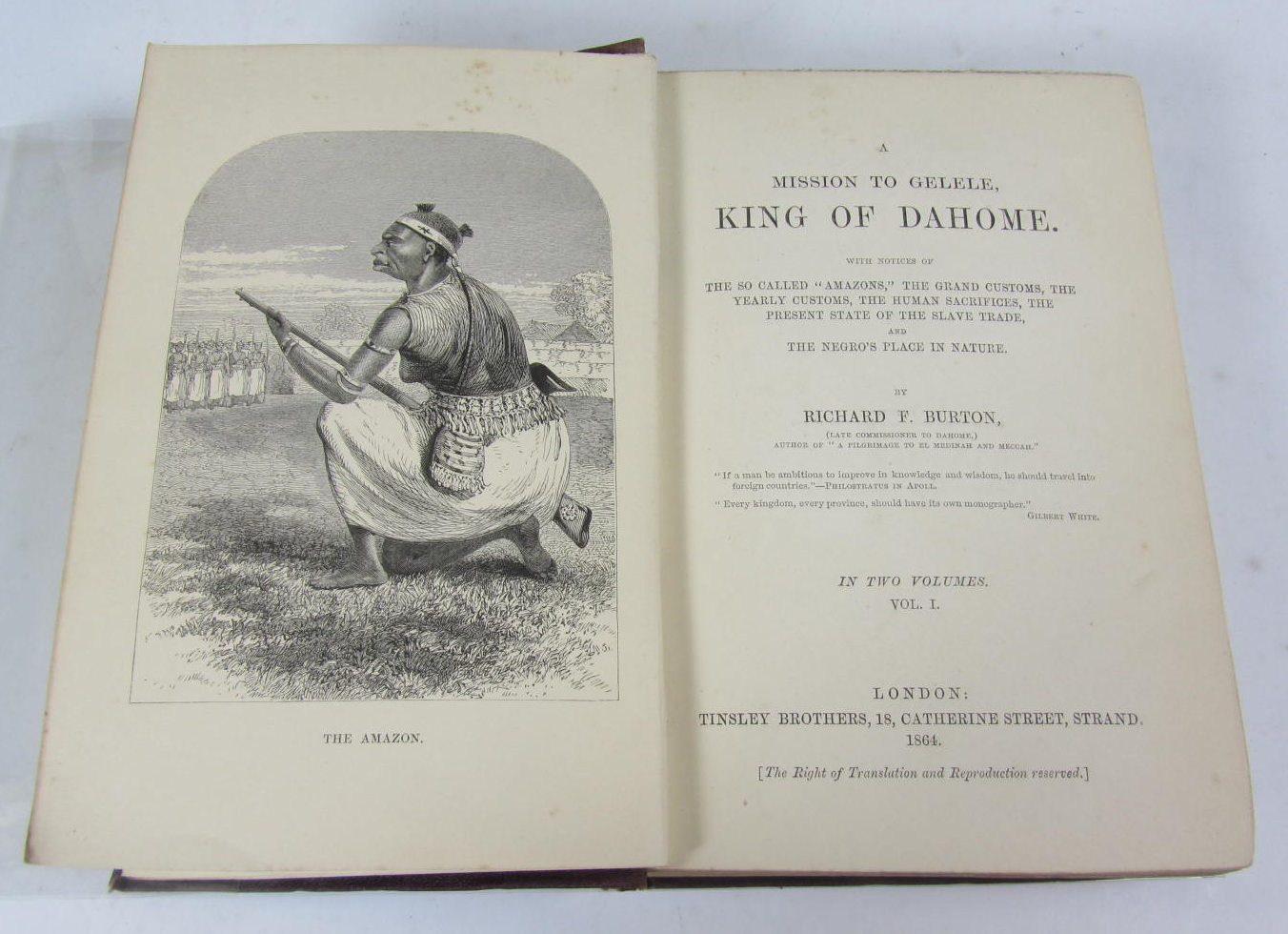 A Mission to Gelele, King of Dahome ... London: Thsley Brothers, 1864. 2 volumes, first edition, 8vo, engraved frontispiece to each volume, contemporary ownership name on half-title with bookplate of Helen Wright Halston Library, original brown embossed cloth gilt, lightly faded to spine (2)