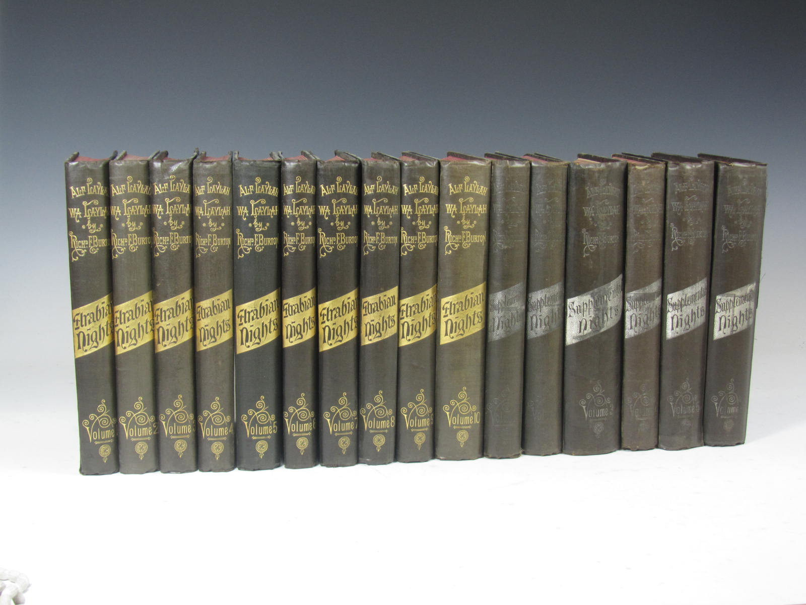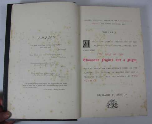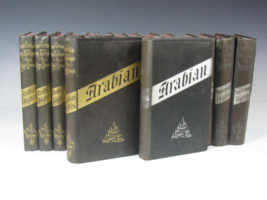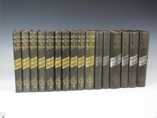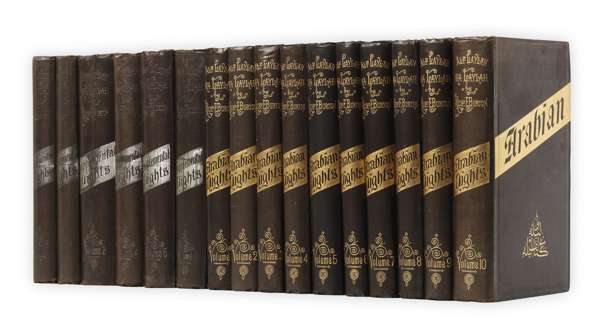 The book of a thousand nights and a night. Benares: Kamashastra Society, 1885. 16 volumes (including 6 supplementary volumes), first edition, 8vo, initial 10 volumes original black cloth gilt, additional 6 supplementary volumes original black cloth with silver decoration, foxing, some fading and rubbing to covers (16)