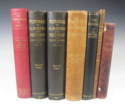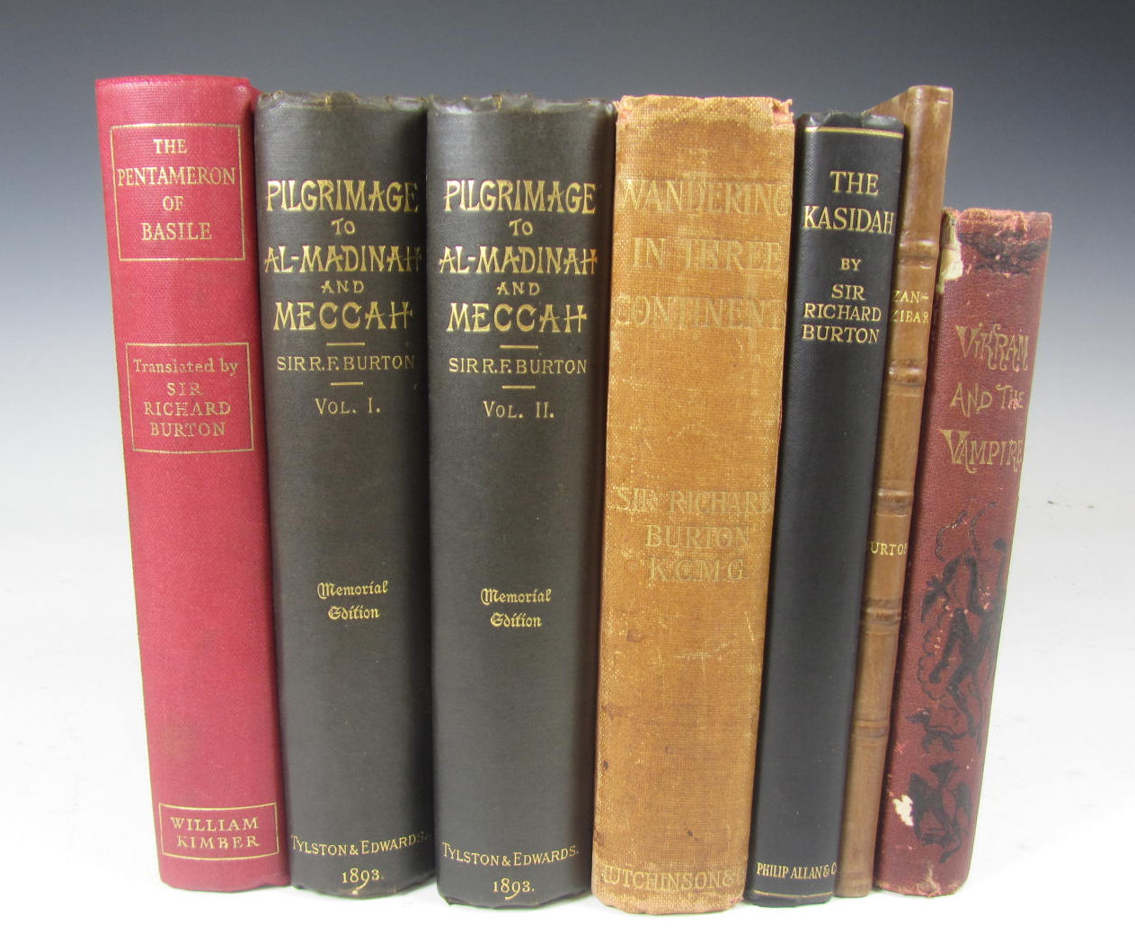 Zanzibar; and two months in East Africa. Edinburgh: William Blackwood & Sons, 1858. 8vo, in 3 parts, consisting of pp.200-224 extracted from the February 1858 issue of Blackwood's Magazine, pp.276-290 of the March issue and pp.572-589 of the May issue, bound together in modern half calf gilt, some pages laid down, slight soiling to title-page (that of Blackwood's Edinburgh Magazine, vol. LXXXIII); [Idem] Vikram and the vampire. Longmans, Green & Co., 1870. First edition, second issue; [Idem] - Burton, Isabel, editor Personal narrative of a pilgrimage to Al-Madinah & Meccah. Tylston and Edwards, 1893. 2 volumes, memorial edition, 8vo, original cloth, bookplate; [Idem] Wanderings in three continents. Hutchinson, 1901. 8vo, original cloth gilt; [Idem] The Kasîdah... Philip Allan & Co., 1925. 8vo, original cloth gilt; [Idem] The pentameron... William Kimber, 1952. 8vo, red cloth; sold not subject to return (7)