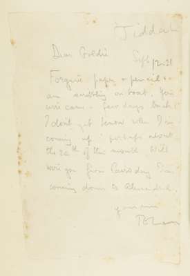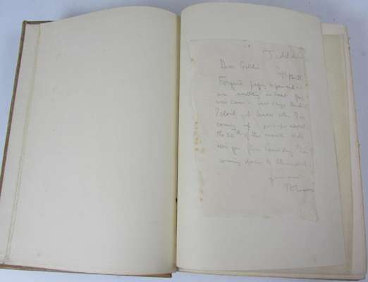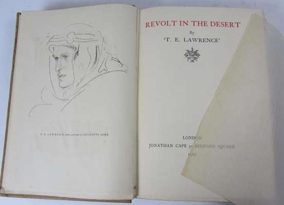 Revolt in the Desert. London: J. Cape, 1927. First edition, large 8vo, with autographed letter, in pencil, signed, to [Captain, later Major] Harry Goldie "Dear Goldie, Forgive paper & pencil... your wire came a few days back. I don't yet know when I'm coming up: perhaps about the 24th of this month. Will wire you from Cairo day I'm coming down to Alexandria, yours ever, T.E. Lawrence", Jiddah, 12. Sept. 21", pasted to verso of frontispiece portrait, endpaper inscribed "H. Goldie, 14.3.1927", plates, original buff buckram, spine faded