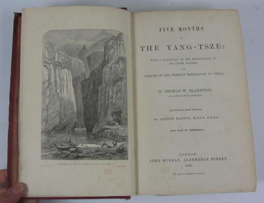 Five months on the Yang-Tsze... John Murray, 1862. First edition, 8vo, frontispiece, 15 plates and 2 folding maps by Arrowsmith, original red cloth gilt, hinges weak, covers rubbed and soiled; Wise, Henry An analysis of one hundred voyages to and from India and China... J.W. Norrie..., 1839. 8vo, frontispiece and 4 lithographed plates, inscribed to John Abel Smith Esq "...with the author's respects.", original?] purple cloth gilt, some spotting, covers faded and stained; White, John A voyage to Cochin China. Longman, Hurst..., 1824. 8vo, half-title, boards, lacking pp.369-70, some foxing; all with Cruising Association blind-stamps, bookplates and gilt stamp to covers and spines (3)