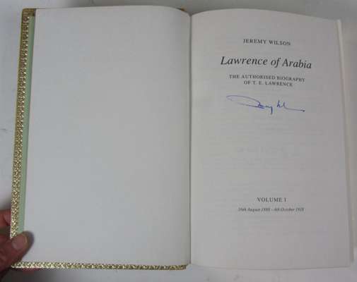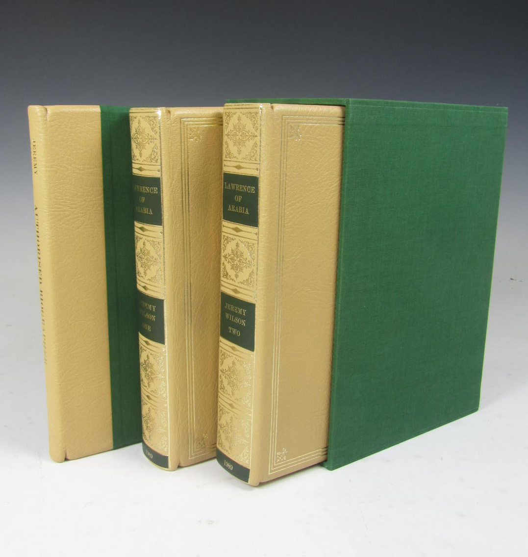 Lawrence of Arabia, the authorised biography of T.E. Lawrence. London: Issued privately by arrangement with William Heinemann Ltd, 1989. 2 volumes, 8vo, number 2 of 56 copies AND one of ten copies bound in cream morocco gilt, accompanied by Wilson's research essay, again especially bound AND other reference material, including a corrected and signed proof of chapter 38; all in green buckram slipcase, books and some other items signed