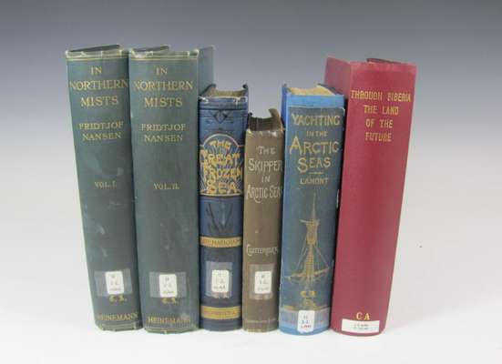In northern mists. William Heinemann, 1911. 2 volumes, large 8vo, original blue-green cloth gilt with sunrise motif to upper covers; Markham, Albert Hastings, Captain The great frozen sea. Daldry, Ibister..., 1878. 8vo, original cloth gilt; Clutterbuck, Walter J. The skipper in Arctic seas Longmans, Green..., 1890. 8vo, original pictorial cloth; Lamont, James Yachting in the Arctic seas... Chatto and Windus, 1876. 8vo, blue cloth gilt, rebacked; and another by Nansen, all with Cruising Association bookplates, blind-stamps and Cruising Association gilt stamps to upper covers and spines, some darkening/spotting and bumping and soiling/fading to covers, sold not subject to return (6)