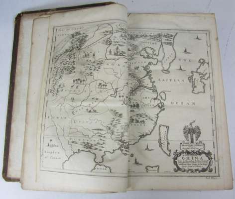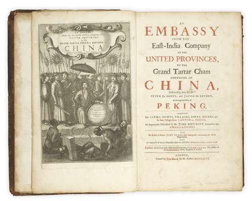 An embassy from the East-India Company of the United Provinces to the grand Tartar Cham emperour of China... London: John Macock, 1669. Folio, engraved title, printed title in red and black, double-page map, 19 (of 20?) plates (including a double-page plan), lacking the portrait, contemporary panelled calf, occasional spotting & staining, slight darkening, a few leaves torn, a couple of small holes with loss of some letters, rust-holes affecting text at p.73, lacks final blank leaf, previously rebacked, very worn, upper cover detached, lower joint split [ESTC R9298]