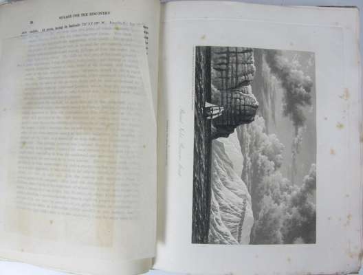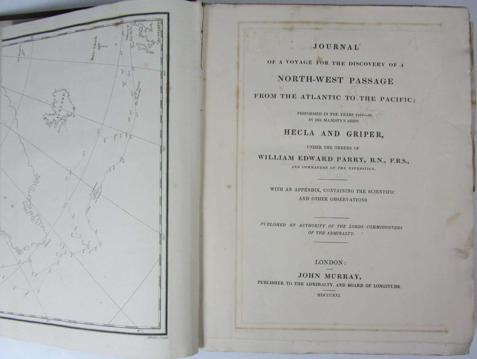Journal of a voyage for the discovery of a North-West passage from the Atlantic to the Pacific. London: John Murray, 1821. First edition, 4to, 14 engraved plates and 6 charts, some folding, errata slip at p.1, original boards, uncut, some offsetting, spine worn with some loss, lower board detached