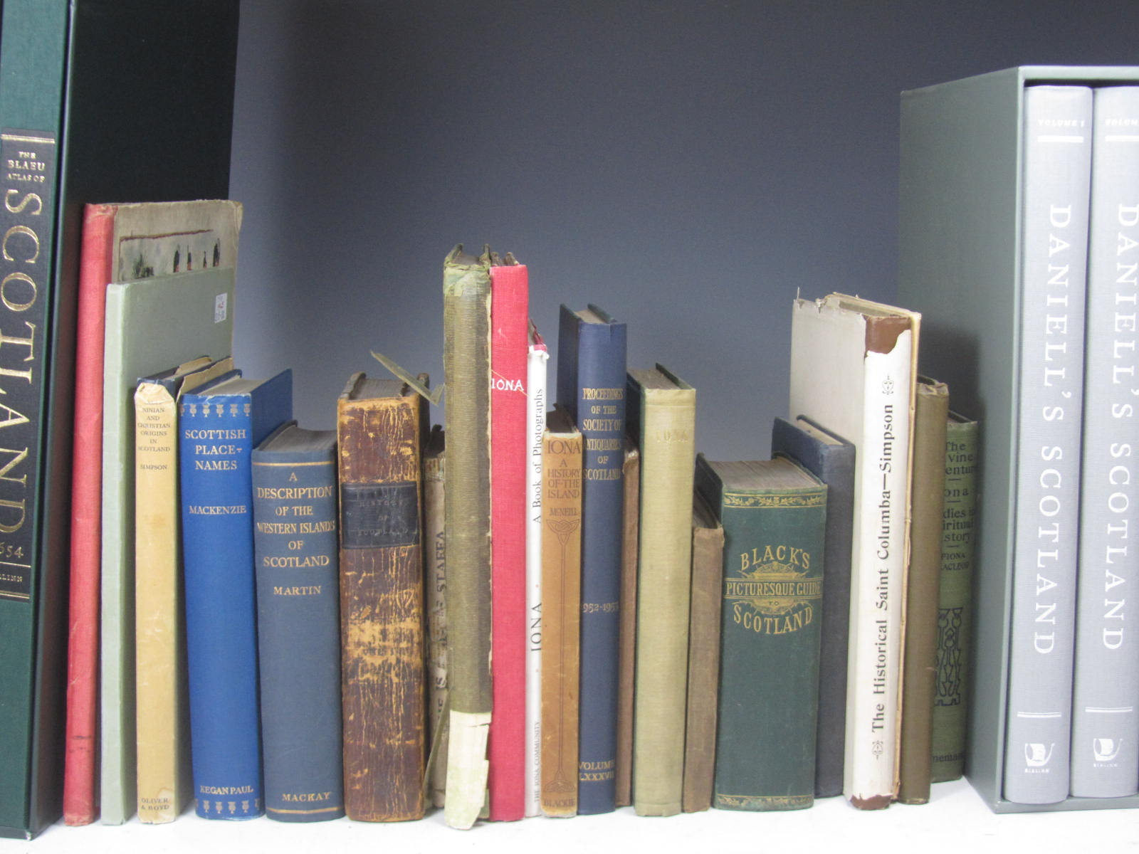 Antiquities of Iona. 1850. 4to, lithographed vignette title and 50 plates, original cloth, spine worn; Bucklers, Messrs. The cathedral, or abbey church of Iona. 1866. 4to, 18 plates, original pictorial boards, some marginal annotations, rebacked; Simpson, W.D. The historical Saint Columba. Aberdeen, 1927. 4to, dustwrapper; Geddes, Patrick Songs and tales of St. Columba and his age. 1897. 4to, sewn as issued; Morrison, John Iona, a book of photographs. Edinburgh, 1949. 4to, presentation copy to Sir David Russell, dustwrapper; Sharp, William The divine adventure. Iona. 1919. 8vo, original cloth; Scott, A. The celts and druids. North Shields, 1894. Presentation copy from the author to Wm. Scott, original cloth; McNeill, F.M. Iona. 1920. 8vo, presentation copy from the author, cloth-backed boards, frayed dustwrapper; [Anderson, William] The family of Iona. 1850. 8vo, original cloth, spine faded; Groves, Percy History of the 42nd Royal Highlanders - The Black Watch. 1893. 4to, 5 chromolithographed plates, original pictorial boards, rubbed; Blaeu, Jan The Blaeu atlas of Scotland. Edinburgh: Birlinn/N.l.s., 2006. Large folio, original quarter cloth, slipcase; Daniell, William Daniell's Scotland. A voyage round the coast of Scotland and the adjacent isles. Edinburgh: Birlinn/N.l.s., 2006. 2 volumes, folio, number 257 of 600 copies, coloured plates, quarter cloth, slipcase; A. & C. Black, publishers Black's road & railway travelling map of Scotland. Map folding into pictorial cloth covers, slightly soiled; and 11 others related to Scotland, including 2 odd volumes (24)