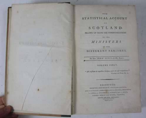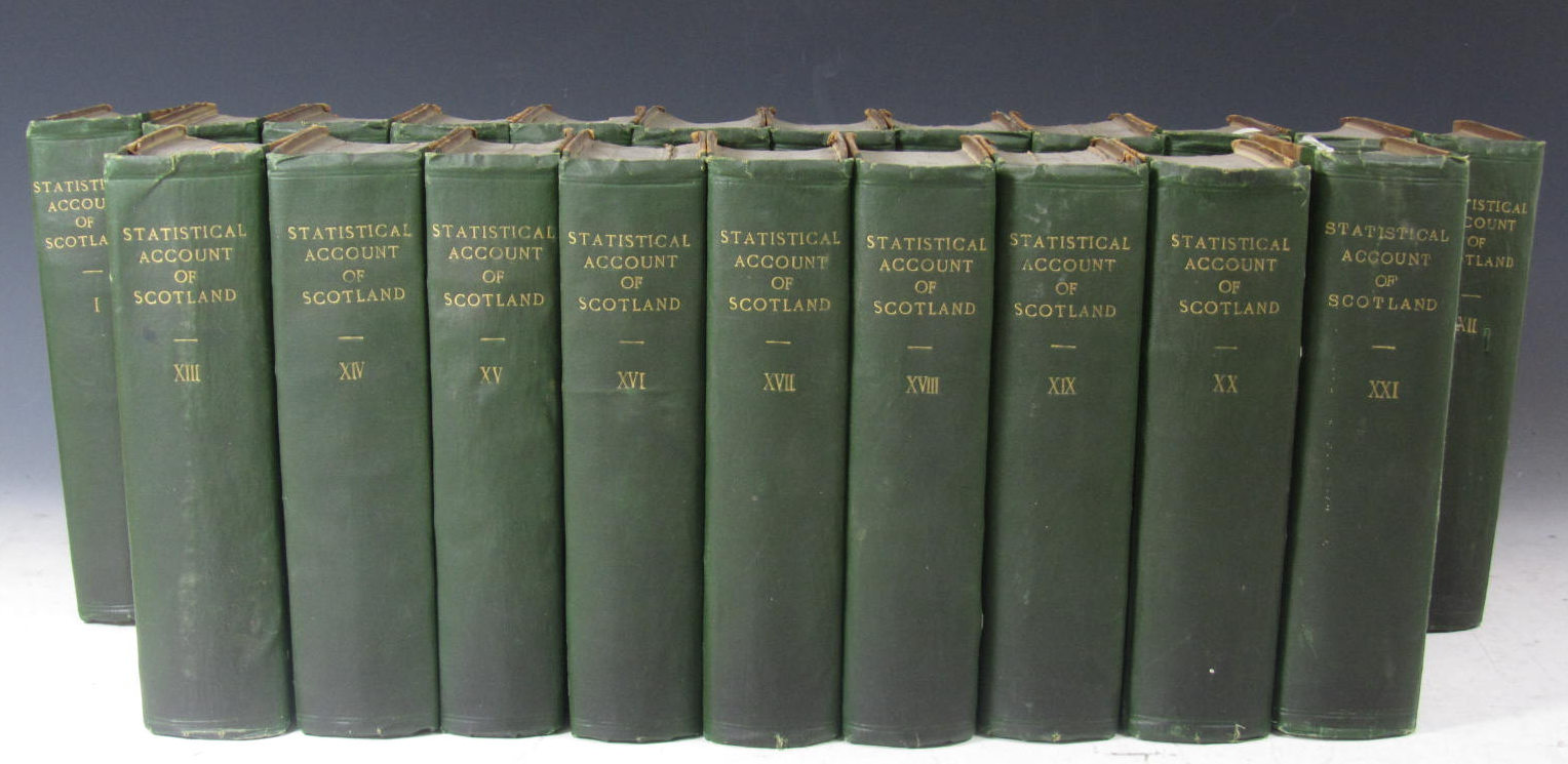 The statistical account of Scotland... Edinburgh: printed by William Creech, 1791-1799. First edition, 21 volumes, 8vo, green quarter cloth, bookplates, some spotting and darkening, covers a little rubbed and soiled; sold not subject to return (21)