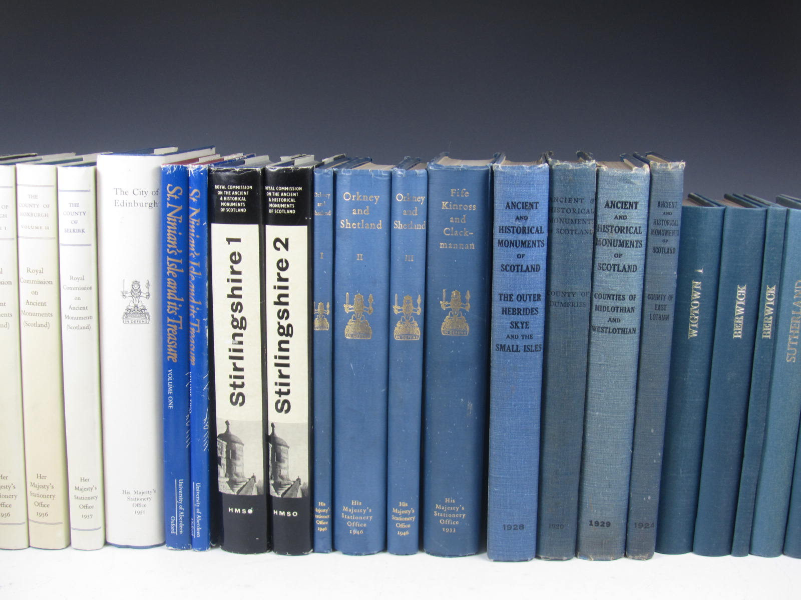 34 titles from the RCAHMS, 1909-2001, including: First report and inventory of monuments and constructions in the county of Berwick. Edinburgh, 1909; 7 volumes covering Argyll from 1971-1992 with dust-jackets; The City of Edinburgh, 1951, dust-jacket; and a range of others, full list avaliable upon request, sold not subject to return (35)