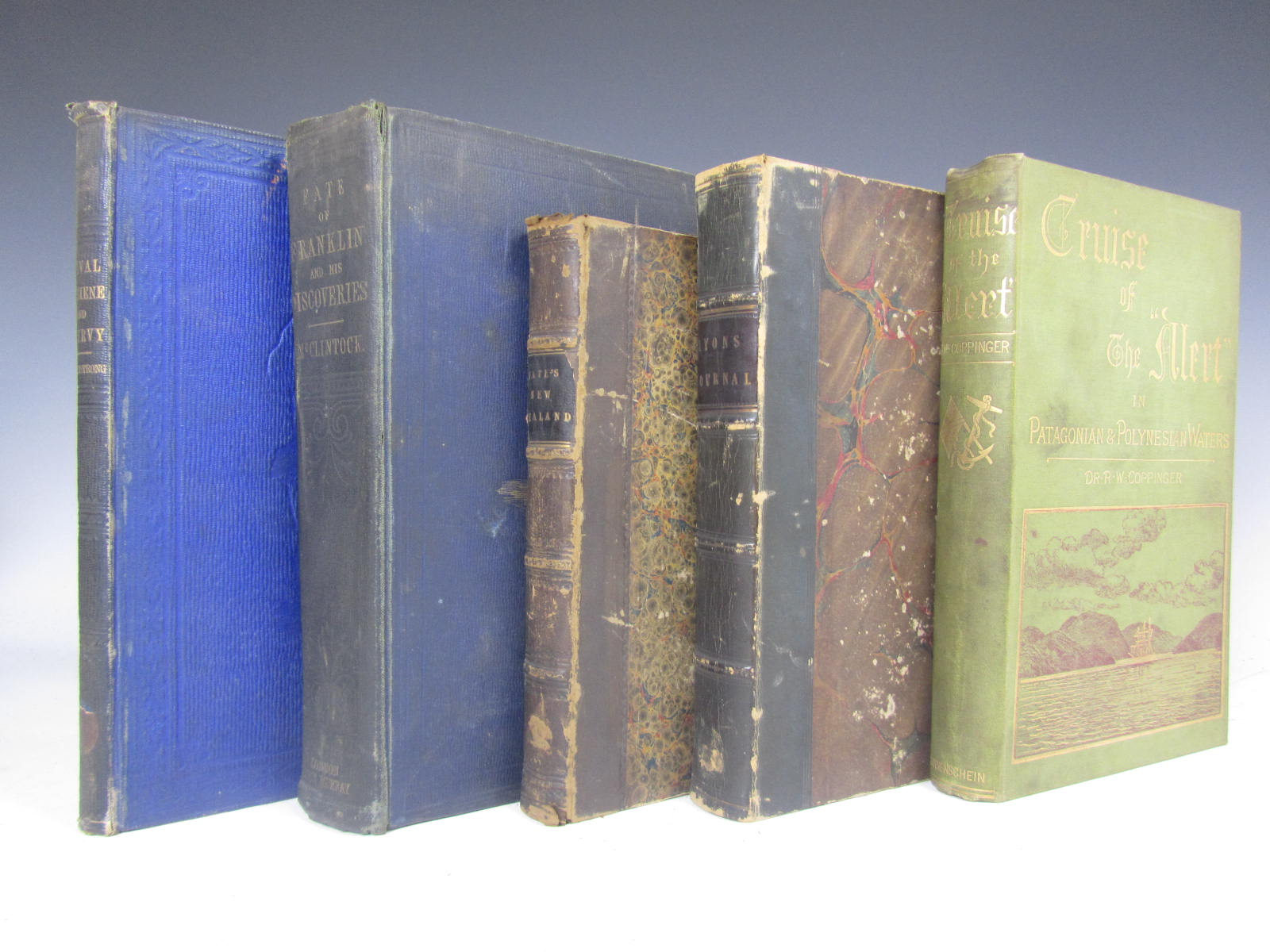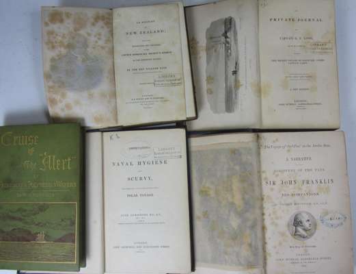 Observations on naval hygiene and scurvy. London, 1858. First edition, 8vo, original cloth; McClintock, Capt. A narrative of the discovery of the fate of Sir John Franklin. 1859. 8vo, folding map in pocket, plates, original cloth, spotting; Yate, William An account of New Zealand. 1835. Second edition, 8vo, folding map and 10 plates, half calf, some spotting; Lyon, G.F. The private journal of Captain G.F. Lyon. 1835. 8vo, 7 plates, half calf, lacks map, Coppinger, R.W. Cruise of the "Alert". 1885. 8vo, original pictorial cloth; all with RCSI library stamps, bindings dust-soiled (5)