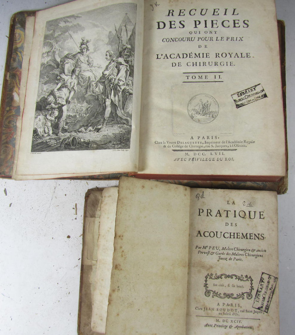 Histoire de la Société Royale de Médecine [for 1779]. Paris, 1782; [for 1784-85]. Paris, 1788; [for 1786]. Paris, 1790; [for 1787-88]. Paris, 1790; Histoire de la Société de Médecine [for 1789]. Volume 10, an VI; Suites des memoirs de l'Arademie Royal des Sciences. Paris, 1790. 4to; calf, worn; Tableaux a joindre au rapport sur les hospices civils de Paris. Paris, an XI. Large folio, original boards, spotted, board detached; Peu, Philippe La pratique des acouchemens. Paris: J. Boudot, 1694. 8vo, 8 engraved plates, lacks portrait and lower board, upper board detached; mostly calf, all worn, RCSI library stamp on titles; and a quantity of French medical books, mainly 19th century; sold not subject to return (quantity)