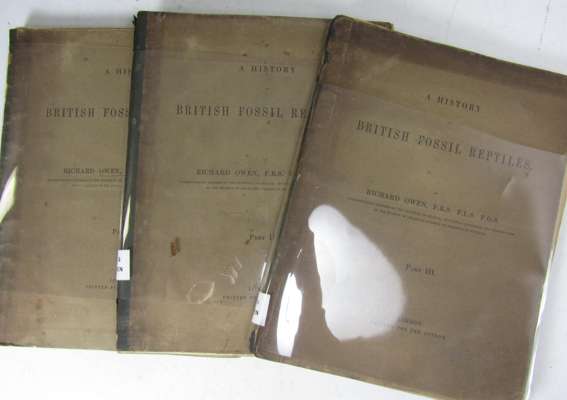 On the archetype and homologies of the vertebrate skeleton. 1848. 8vo, inscribed "from the author" on front endpaper, 6 plates (2 folding) & 3 folding tables, original cloth, rubbed; Owen, Richard On the nature of limbs. 1849. 8vo, frontispiece & 2 plates, original cloth, one plate torn without loss; Owen, Richard A history of British fossil reptiles. For the author, 1849. Paris 1-3 (of 8), 61 lithographed plates, original wrappers, spines worn, covers detaching; Owen, Richard Description of the skeleton of an extinct gigantic sloth. 1842. 4to, 24 lithographed plates, original cloth, 1 folding plate split at folds and repaired, spotted, lacks spine; all with RCSI stamp to title; sold not subject to return (6)