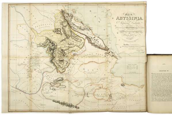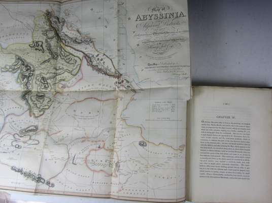 A voyage to Abyssinia. London: F.C. & J. Rivington, 1814. First edition, 4to, folding hand-coloured map, 7 (of 8) charts and 26 plates, (lacks plate 33), 2 engravings in text, half calf, RCSI library stamp & blindstamp to title, some spotting, rebacked, rubbed