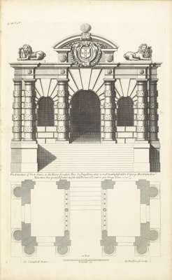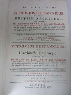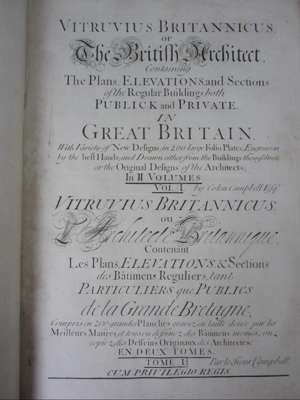 Vitruvius Britannicus, or the British architect... [London, 1722 or 1725?]-1731. Volumes 1-3 (of 5), folio, 298 (of 300) plates on 243 sheets (pagination counts engraved titles and dedication as plates and counts double plates as two singles), volume 3 title-page in red and black but lacks 2 plates, [ESTC for volumes 1-2 possibly: T469352, listing 1 copy in the British Isles and 3 elsewhere; ESTC for volume 3: N56037]; uniform calf gilt, bookplates including bookplate in volume 1 of John Day [at] Lincoln's Inn, occasional slight darkening/foxing in volume 1, joints weak, rubbed (3)