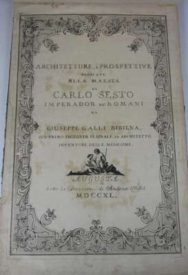 Architetture, e prospettive. Augsburg: Andrea Pfeffel, 1740. Folio (570 x 370mm.), bound at top edge, engraved title-page, engraved portrait of the dedicatee, Emperor Charles VI, engraved dedication, engraved allegorical frontispiece, 48 (of 50) engraved plates, contemporary blue boards, lacking [2]p. of text, lacking 2 plates (no.7 from part II, no.10 from part V), first few leaves slightly friable, part IV plate 1 shaved on right-hand side, occasional light staining, binding slightly rubbed [BAL RIBA 1165; Cicognara 431; Fowler 136]