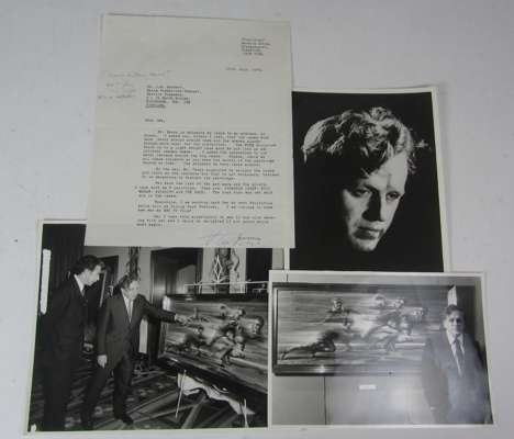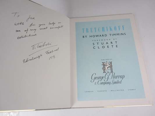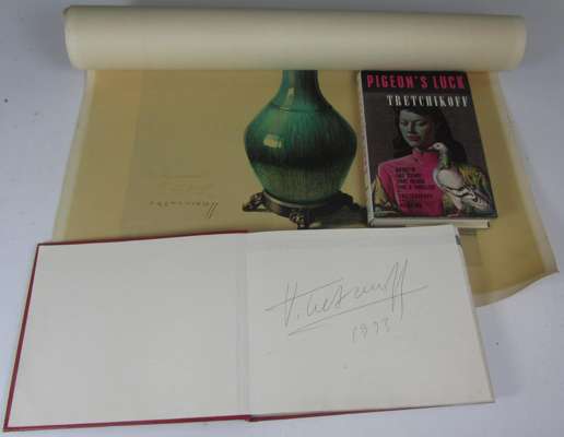 Timmins, Howard Tretchikoff. George G. Harrap & Company Limited, [1969?]. Folio, signed and inscribed by Tretchikoff, original grey buckram in gold dust-jacket; [and] Three typed, signed letters dated 1973-74, from Tretchikoff to senior staff at Patrick Thomsons in Edinburgh, who were hosting a Tretchikoff exhibition during the Edinburgh Festival, along with other correspondence regarding the exhibition; [and] The exhibition visitors' book, signed by Tretchikoff to front free endpaper, with three photographs of Tretchikoff and the exhibition; Tretchikoff, V.G. Pigeon's luck. Collins, 1973 8vo, dust-jacket; [and] A signed Tretchikoff print of flowers (3 books, 3 photographs, 1 print, 15 leaves of letters and documents)