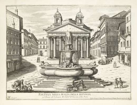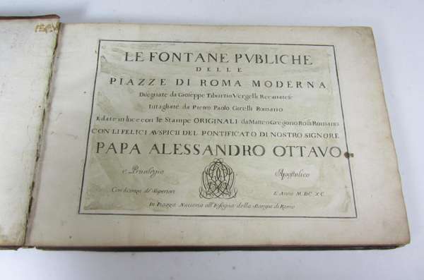 Le fontane publiche delle piazze di Roma moderna. Rome: Matteo Gregorio Rossi, 1690. First edition, engraved title-page, engraved dedication, 29 engraved plates; [bound with] Du Pérac, Etienne Le cospicue e meravigliose fabriche degli antichi Romani hoggi ridotte in rovine. Rome: Giuseppe Giulio Rossi, 1709. Engraved title-page, engraved dedication, 39 engraved plates, 2 works in one volume, oblong folio (271 x 400mm.), contemporary calf, spine gilt in compartments, binding rubbed, spine chipped [Rossetti 11303 & 2358; cf. BAL RIBA 3415 and 3833, both 1773 editions]