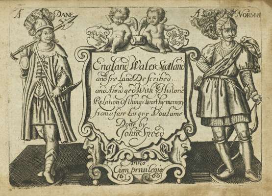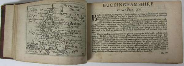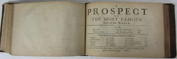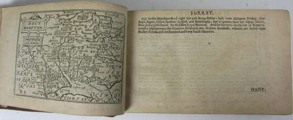 England Wales Scotland and Ireland described and abridged. [London], 1666. Oblong 8vo, engraved title, engraved table, folding map of England, Scotland and Ireland, and 63 maps (including folding maps of England & Yorkshire) engraved by Pieter van der Keere; A prospect of the most famous parts of the world. London: Roger Rea, 1668. 20 engraved maps, 2 parts in one volume, 18th century reversed calf, slight discolouration to first title margin, upper cover detached, slightly spotted, small hole to margin of X1, X6 [Hebrides] torn without loss, a few letters of headlines just shaved