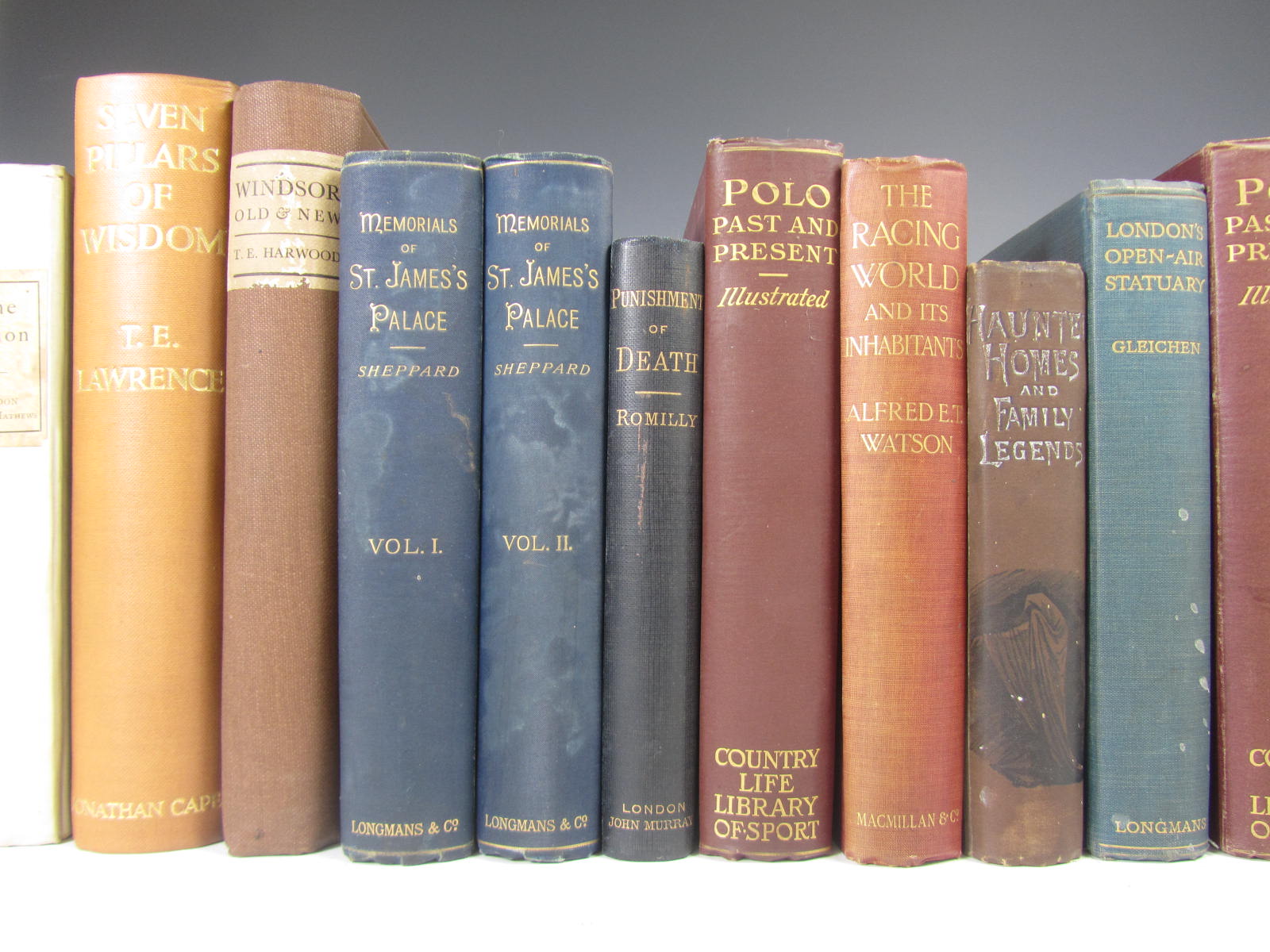 The haunted homes and family traditions of Great Britain. 1901. 8vo; Sheppard, E. Memorial of St. James's Palace. 1894. 2 volumes; Gleichen, E. London's open-air statuary. 1928; Rayne, H. The ivory raiders. 1923; Cunninghame Graham, R.B. The canon... pagan mystery. 1897; Romilly, H. The punishment of death. 1886; Dale, T.F. Polo past and present. 1905; Watson, A.E.T. The racing world and its inhabitants. 1904; Brunet-Debaines, A. & others Picturesque architecture. 1887. Folio, plates; Harwood, T.E. Windsor Old and new. 1929; Lawrence, T.E. Seven pillars of wisdom. 1936. 4to, cloth; Lang, A. Oxford. 1888. Folio, etchings, cloth, soiled; Loftie, W.J. Windsor. 1886, cloth; Townshend, R.B. The tenderfoot in New Mexico. 1923, spine faded; Patterson, J.H. The man-eaters of Tsavo. 1908; Hulme, F.E. and D. Hibberd Familiar garden flowers. 5 volumes, coloured plates, bindings very worn; Collingwood, S.D. The Lewis Carroll picture book. 1899, cloth; Loftie, W.J. Windsor. 1886. Folio, no. 2 of 100 large paper copies, with proofs of plates, brown quarter morocco, t.e.g.; most original cloth; and many others, most c.1880 - 1930; sold not subject to return (quantity)