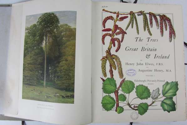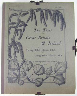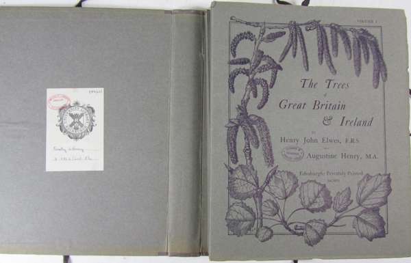 The trees of Great Britain & Ireland. Edinburgh: Privately printed, 1906-1913. 7 volumes, 4to, 6 frontispieces (5 coloured), 7 colour title-pages and 414 plates, original wrappers inside original printed card cases with ties, cancelled Edinburgh University bookplates, library stamps, some accession numbers and ink library markings, occasional light foxing and dust-soiling, cases a little faded, chewed and rubbed in places (7)