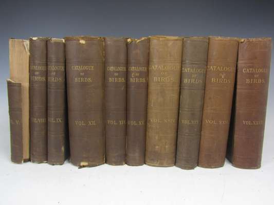 Catalogue of the birds in the British Museum. London: British Museum, 1881-1895. Comprising volumes: 5,8-9,11,13-27, 2 copies of volume 22, 8vo, hand-coloured plates, original cloth; sold not subject to return (20)