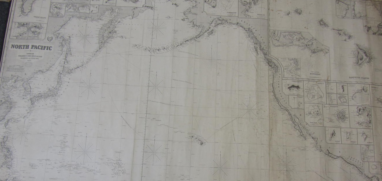 North Pacific Ocean. London, 1880. Chart number 186, c.188x102cm, blue-back rolled chart with black fabric tape edging, a little foxing and a small amount of light soiling