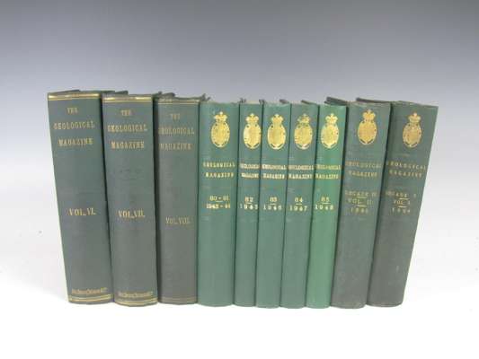 The geological magazine. London, 1864-1881, 1883-1973. Comprising: volumes 1-10; decade 2 volumes 1-8 & 10; decade 3 volumes 1-10; decade 4 volumes 1-6 & 8-9; decade 5 volumes 1-10; decade 6 volumes 1-7; and volumes 58-110 of whole series, with several duplicates; 8vo, plates, many in half calf and others in green cloth, some spines worn, occasional library stamps; sold not subject to return (quantity)