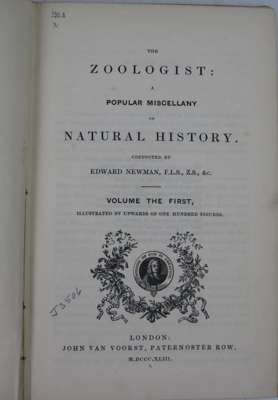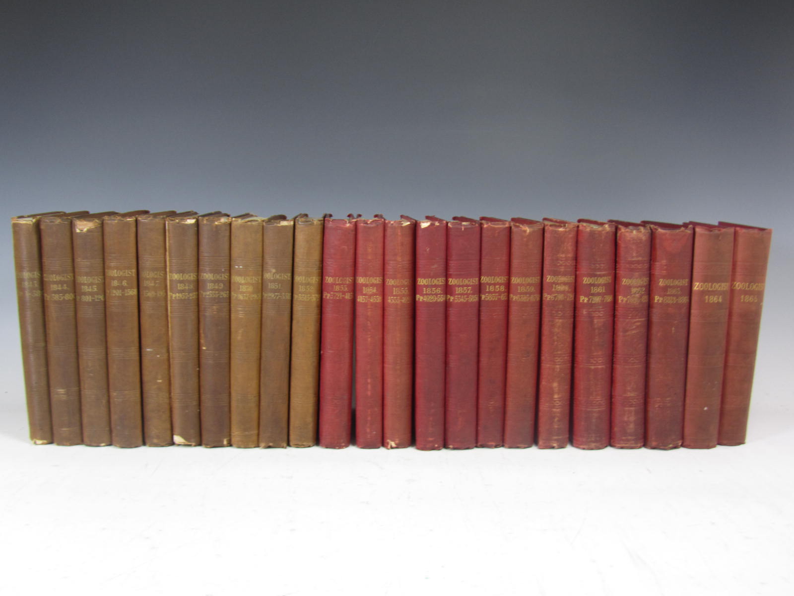The Zoologist. London: 1843-1914. 72 volumes, lacking year 1887, including Darwin, Charles Three Papers on the Tendency of Species to Form Varieties, pp.6293-6308 in volume 16 [1858] an extract from an unpublished work, and Wallace, Alfred Russel Note on the Theory of Permanent and Geographical Varieties, pp.5887-88 in volume 16 [1858]; 8vo, many in red cloth gilt, some half morocco, some library stamps, some rubbed; sold not subject to return (72)