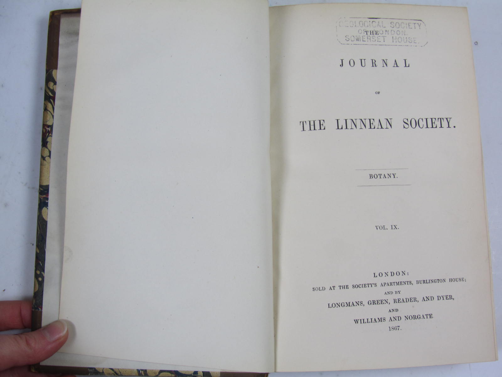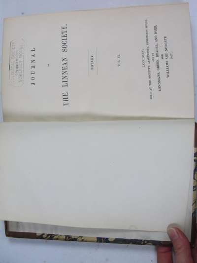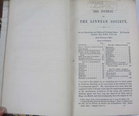 On the movements and habits of climbing plants [1865], in The Journal of the Linnean Society, London: Longmans, Green..., 1867, volume IX, pp.1-120. First edition, first issue, Freeman 833, 8vo, contemporary half calf with Geological Society gilt stamps, without the green printed wrapper of the part, Geological Society of London stamps to journal title-page and page 1 (and elsewhere throughout volume), library bookplate, some rubbing