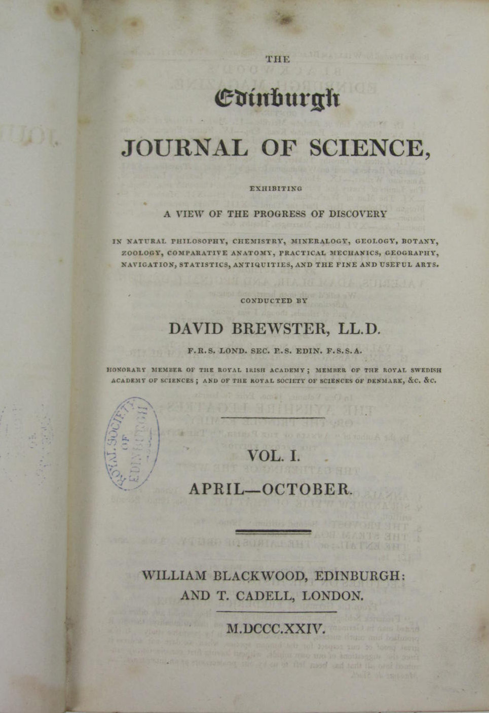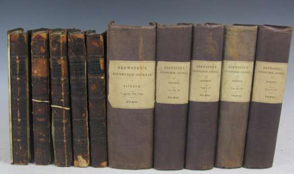 The Edinburgh journal of science. Edinburgh, 1824 - 1831. 8vo, first series volumes 1-4, 6-10 [bound in 6 vols]; New series volumes 1-6 [in 3 vols, duplicate of volume 5, many pages uncut], half calf, some cloth, some covers detached; [with] The Edinburgh journal of natural and geographical science. Edinburgh, 1820. Volumes 1-2, 8vo, plates, some coloured, folding maps, Royal Society of Edinburgh stamps on the half calf volumes; sold not subject to return (12)
