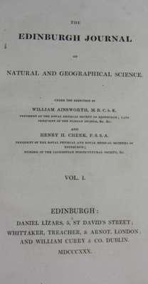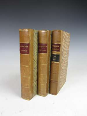 Edinburgh journal of natural and geographical science. Edinburgh, 1820. 3 volumes, 8vo, containing papers by William Jardine amongst others, contemporary half calf, hand-coloured plates, Royal Society of Edinburgh stamp in volume 3; sold not subject to return (3)
