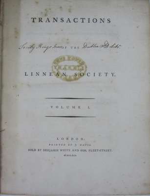 Transactions of the Linnean society. London, 1791-1875. First series volumes 1-14, 15-16 [part the third], 17-18, 19 [part the second], 21-30; Second series, zoology: 1879-1888, volumes 1-5; Second series, botany: 1880-1894, volume 1-4, 6, 8; with two general indexes, for volumes 1-25, 1-30, 4to, bound in both calf and half calf, hand-coloured plates, rubbed, with several covers detached, King's Inn's library Dublin and Royal Society stamps; with parts in original wrappers for the years 1808-1875 (incomplete, part years only); sold not subject to return (86)