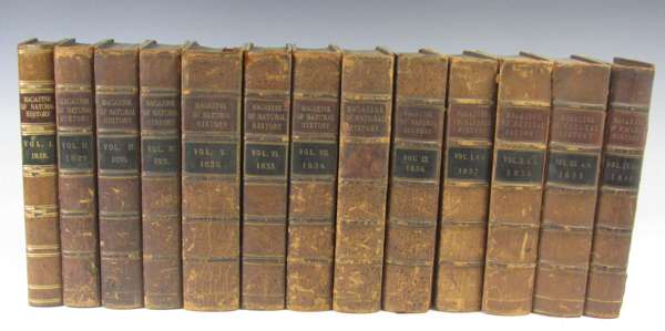 The magazine of natural history... Longman, Rees..., 1829-1840. 13 volumes (volumes I-IX of first series and I-IV of the new series), 8vo, contemporary calf gilt, volume 1 neatly rebacked, Signet Library gilt stamps to covers, some chipping and rubbing, some spines detached; [Idem] Arboretum et fruticetum Britannicum... Longman, Brown..., 1844. 8 volumes, second edition, 8vo, plates, original green cloth gilt; sold not subject to return (21)