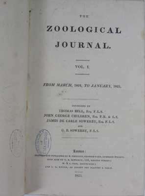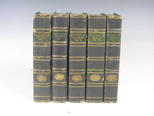 The zoological journal. London, 1825-1835. Volumes 1-5, 8vo, plates (some coloured), half calf gilt with raised bands on spines; sold not subject to return (5)
