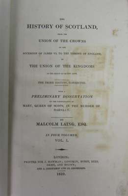 The history of Scotland. London: Longman, Hurst, Rees and Brown, 1819. Third edition (corrected), in 4 volumes, 8vo, calf binding, gilt spine with raised bands; sold not subject to return (4)