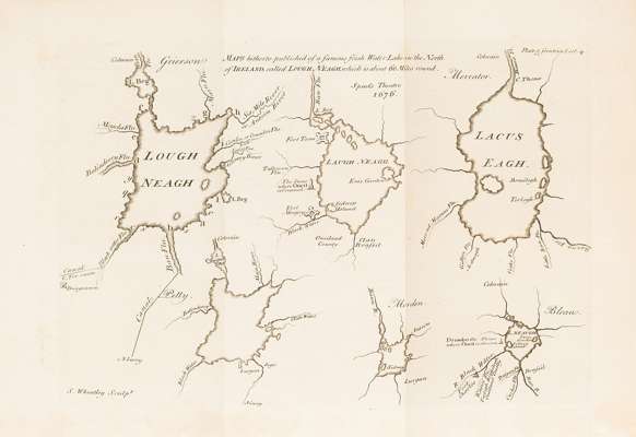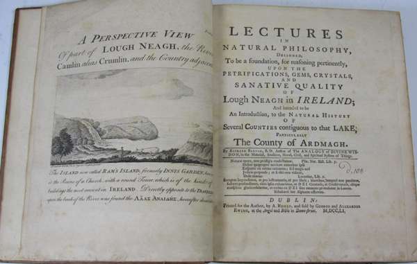 Lectures in natural philosophy designed to be a foundation, for reasoning pertinently, upon the petrification, gems, crystals and sanative quality of Lough Neagh... Dublin: printed for the author by A. Reilly, 1751. 4to, frontispiece, map and 5 plates, 8pp {of 10?] of list of subscribers, [ESTC T88523]; [bound with] [Idem] Some remarks towards a full description of upper and lower Lough Lene, 1751, lacks plate [ESTC T88521]; [bound with] [Idem]A dialogue concerning some things of importance to Ireland, 1751, lacks plate [ESTC T88509]; [bound with] [Idem] Galileo to Urban VIII..., 1758, lacks plate and final leaf, ESTC lists 4 copies in UK libraries [ESTC T184454] ; [bound with] [Idem] A physico-poetical essay..., 1759, ESTC lists 4 copies in UK libraries [ESTC T118315]; contemporary calf, some slight browning, covers rubbed, joints splitting