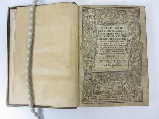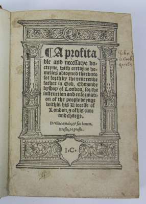 A defence of the true and catholike doctryne of the sacrement... [London: Reynold Wolfe, 1550]. 4to, title within woodcut border, black letter, woodcut initials, 19th century blindstamped brown morocco gilt, g.e., [ESTC S109032; STC 6001], lower quarter of title supplied in very good facsimile, GG1-3 repaired with a few words supplied in facsimile, G4 in good printed facsimile; [Bonner, Edmund] A profitable and necessarye doctryne, with certayne homelies adioyned thereunto set forth by the reverende father in God, Edmonde byshop of London. [Excusum Londini: in aedebus Johannis Cawodi, 1555]. 4to, later calf, [ESTC S109341], lacks BBB1-4, top of 3C4 cut away with some loss, worn, covers detached (2)