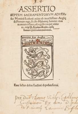 Assertio septem sacrementorum adversus Martinu Lutheru aedita ab invictissimo Anglie & Franciae rege. [Strasbourg: Johann Grüninger, 1522]. 8vo, 50 leaves [A-L4, M6], lacks A1-iv and final 8 leaves (N1-O4) woodcut on title, inscription at foot of title and a few words scored through, [USTC 613593, 7 copies], a few headlines trimmed, tear to J2 repaired; [bound with] Eck, Johannes] Repulsio articulorum Zwinglii caes. maiestati oblatorum. [? Louvain, Rutgerus Rescius], 1530. 8vo, [a1-2, b1-i4, k1-2], woodcut on title, K2 errata leaf at end, [?USTC 437518], 2 works in one volume, 18th century calf, some sidenotes trimmed, head of spine worn