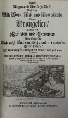 Heilige augen- und gemeuths-ust vorstellend alle sonn- fest- und feyrtaegliche nicht nur evangelien. Augsburg: J.U. Krause, [1706], 2 parts in 1 volume, folio, titles with engraved vignette, 2 unnumbered plates and 120 plates, contemporary calf, rebound retaining original sides, with 4 leaves before title (half title, 4pp. forward, Register)