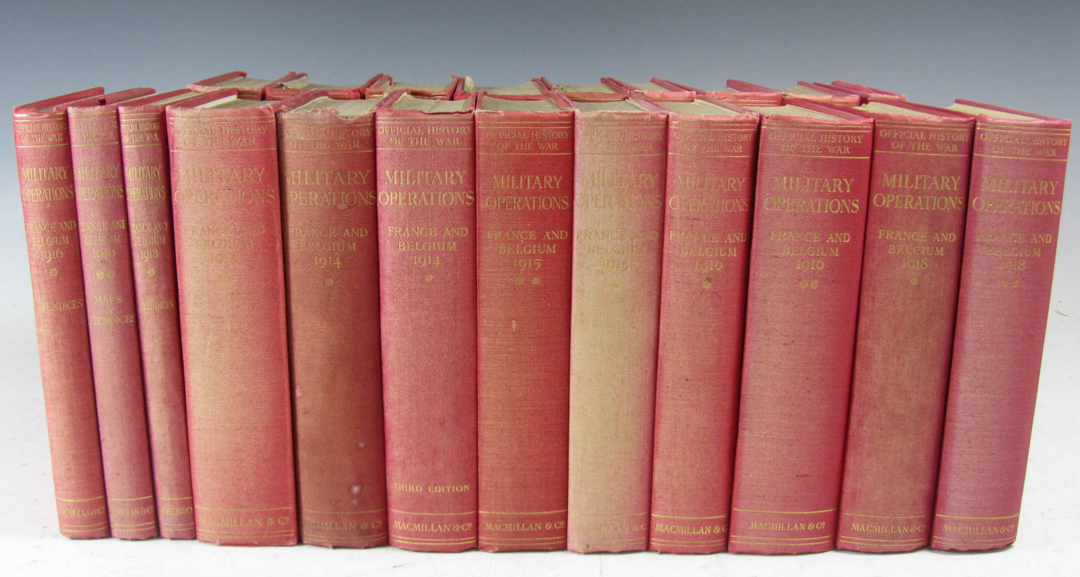 Military operations in France and Belgium. 1927-1937. 12 volumes [2x1914, 2x1915, 2x1916, plus 1916 maps and appendices, and another 1916 appendices, 2x1918 plus appendices, and a 3rd edition of 1913 vol 1], and 7 map sets [1914 vols 1-2 plus additional vol 1, 1915 vol 2, 1916 vol 1, 1918 vols 1-2]; Moberley, Brigadier-General F.J. The campaign in Mesopotamia,1914-1918. London: HMSO, 1923-1927. 4 volumes; Aspinall-Oglander, Brigadier-General C.F. Military operations in Gallipoli. London: W. Heinemann, 1929. 2 volumes [text and maps & appendices]; Falls, Cyril Military operations in Egypt and Palestine. London: HMSO, 1930. 2 volumes, plus additional volume 1, from 1928, and map sets 1 & 2; uniform 8vo, red cloth, some soiling to covers, sold not subject to return (30)