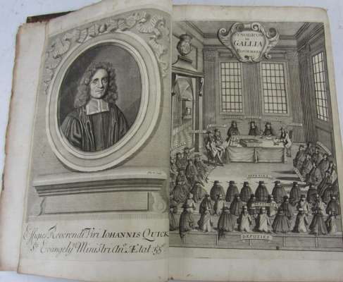Synodicon in Gallia reformata. London: J. Richardson, 1692. 2 volumes, folio, portrait frontispiece, engraved title, title-page in red and black, contemporary calf with later corners, some darkening to pages, a few rust holes occasionally affecting letters, rubbed and worn [ESTC R10251] (2)