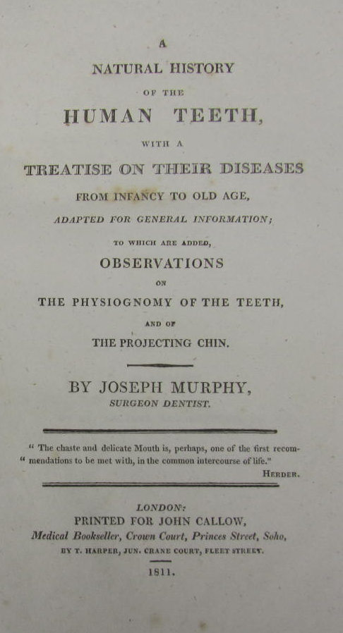 A natural history of the human teeth. London: John Callow, 1811. First edition, 8vo, 2 engraved plates, original boards, uncut, 8pp. publisher's advertisements at end, paper label on spine