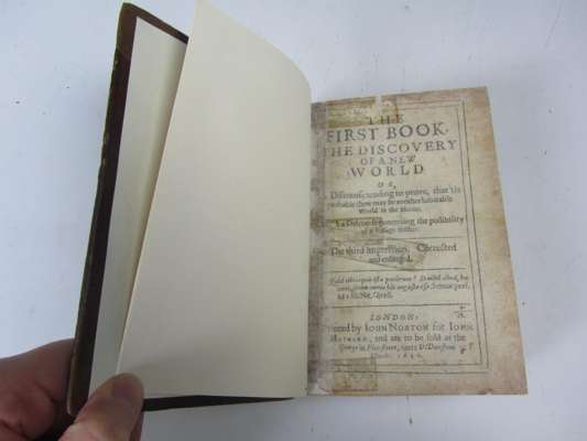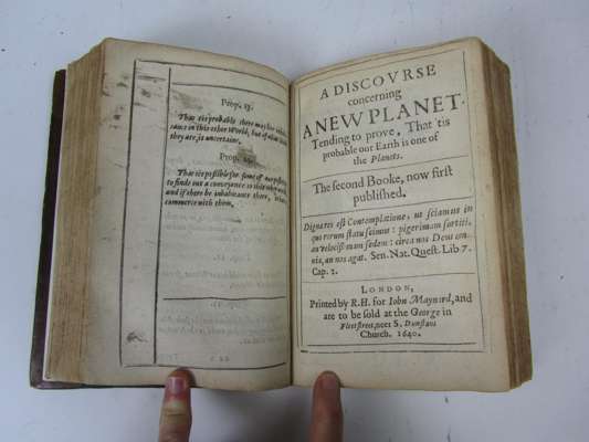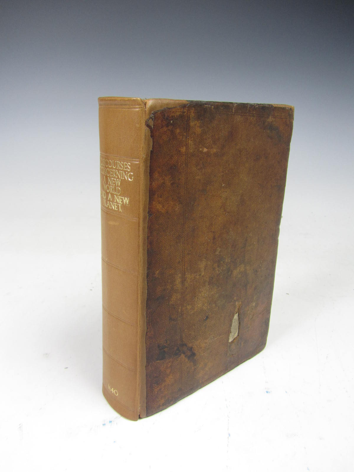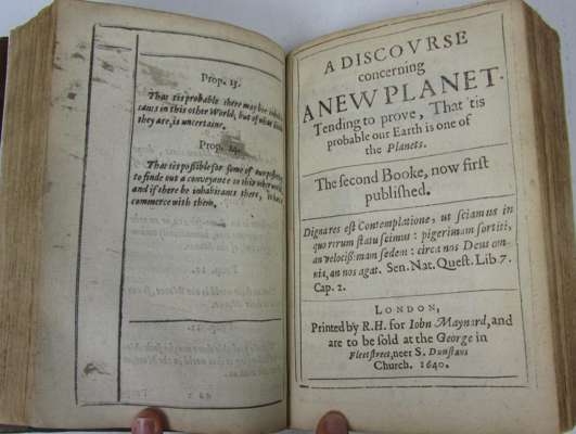 The first book, the discovery of a new world or discourse tending to prove, that 'tis probable there may be another habitable world in the moone... London: John Maynard, 1640. Third impression, 8vo, with A discourse concerning a new planet as called for, both parts in 1 book, contemporary calf, rebacked, title-page and endpaper highly repaired, both parts lacking an initial leaf, including frontispiece, 2a and 2a2 misbound, closed tear to ²C3, occasional soiling, rubbing [ESTC S119973]